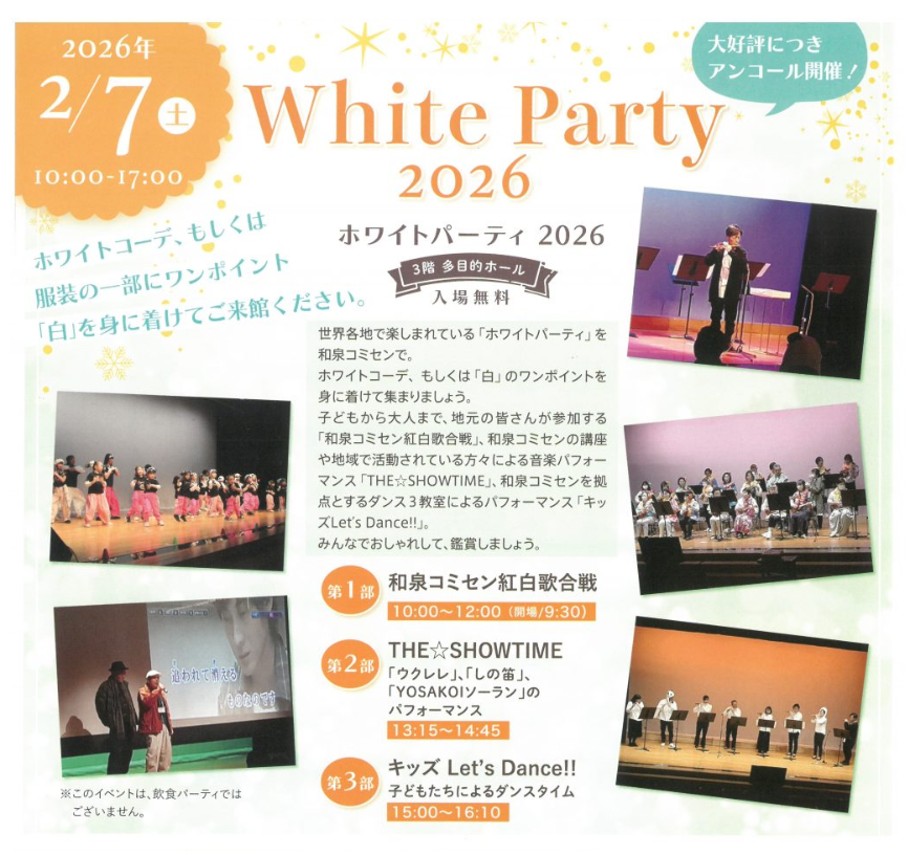 WhitePartyの問い合わせは、和泉市コミュニティーセンターTEL0725-43-0532まで。